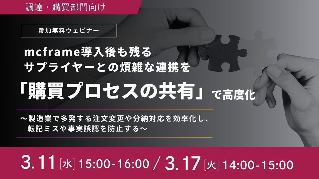 DXでつながる社会の未来を切り拓く 株式会社テクノスジャパン(本社:東京都新宿区、代表取締役 社長執行役員:吉岡 隆、以下「テクノスジャパン」)は、2026年311日(水)と17日(火)に、「mcframe導入後も残るサプライヤーとの煩雑な連携を『購買プロセスの共有』で高度化~製造業で多発する注文変更や分納対応を効率化し、転記ミスや事実誤認を防止する~」と題したWebセミナー(Zoom利用)を開催いたします。