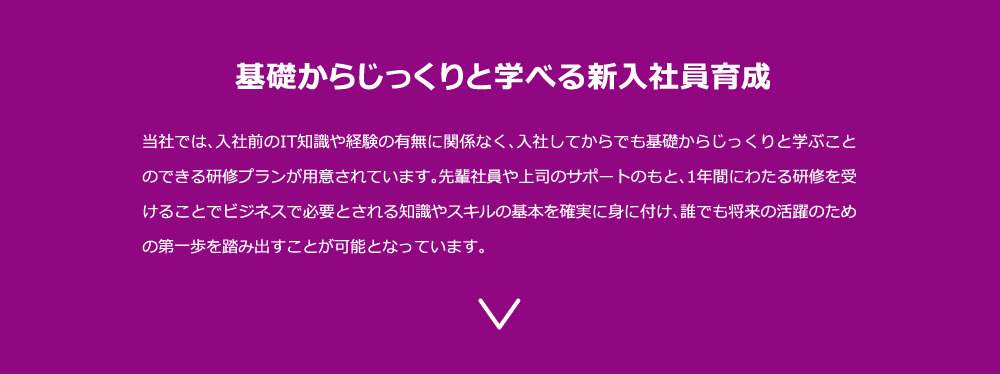 入社前のIT知識や経験の有無を問わず、入社してからでも、基礎からじっくりと学ぶことのできる研修プランをご用意しています。先輩や上司のサポートのもと、約1年間の研修を受けることで、ビジネスで必要とされる知識やスキルの基本が着実に身に付きます。誰でも将来の活躍に向けた第一歩を踏み出すことが可能です。